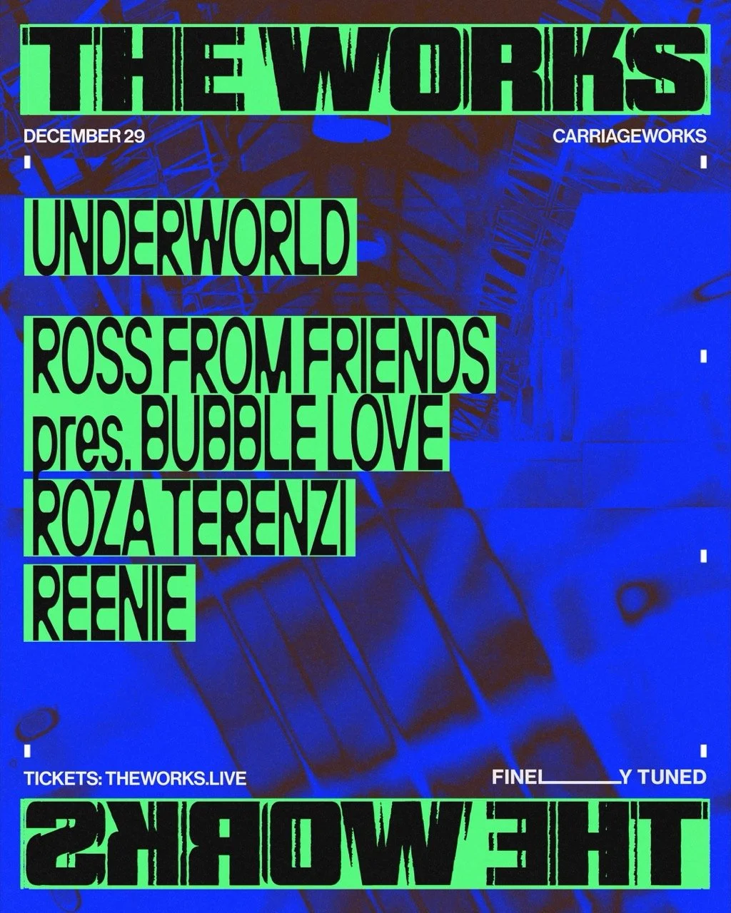 Iconic British anthem makers Underworld descend on THE WORKS alongside Ross From Friends (pres. Bubble Love) and Roza Terenzi.